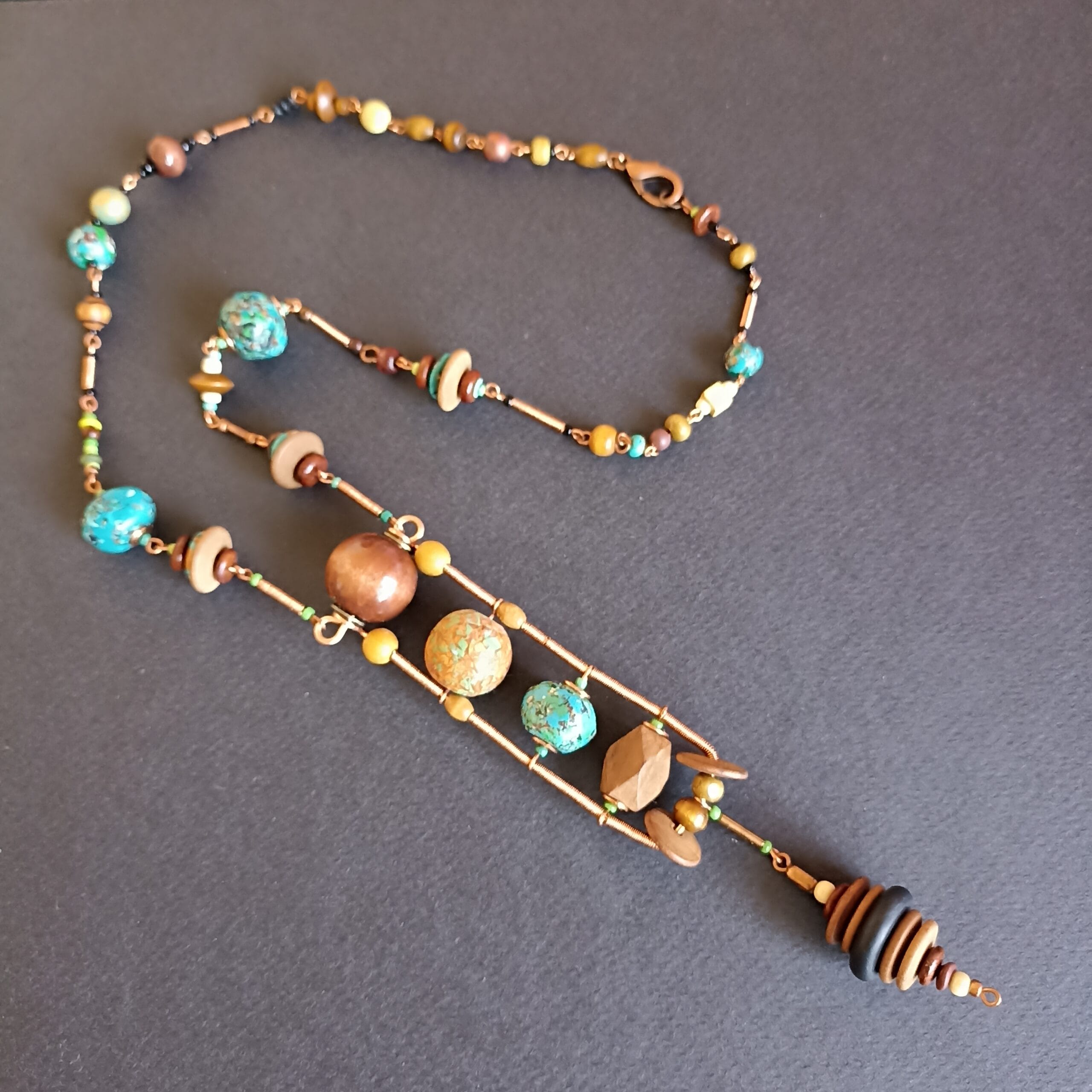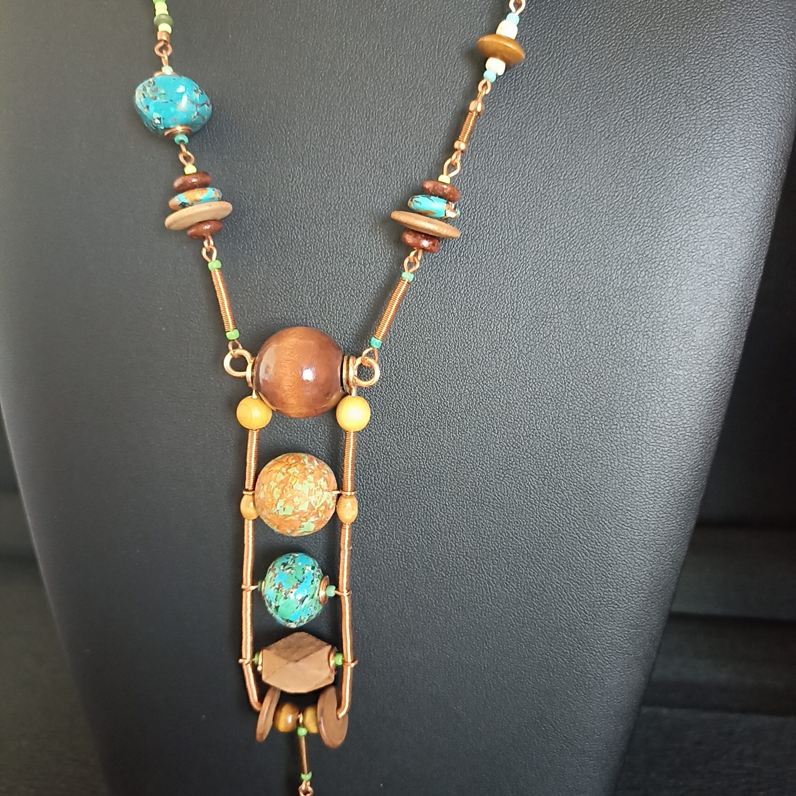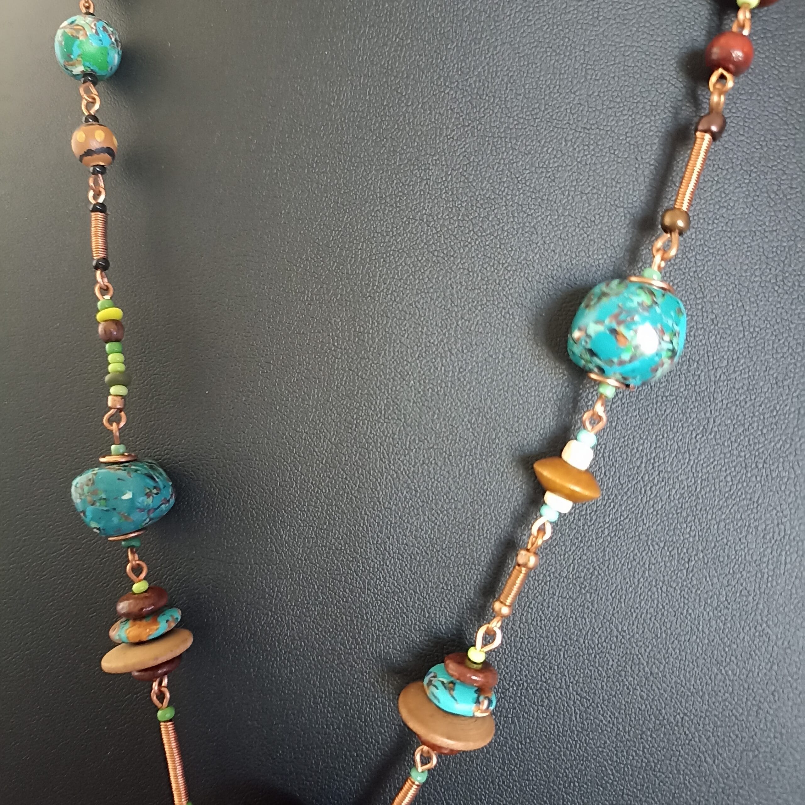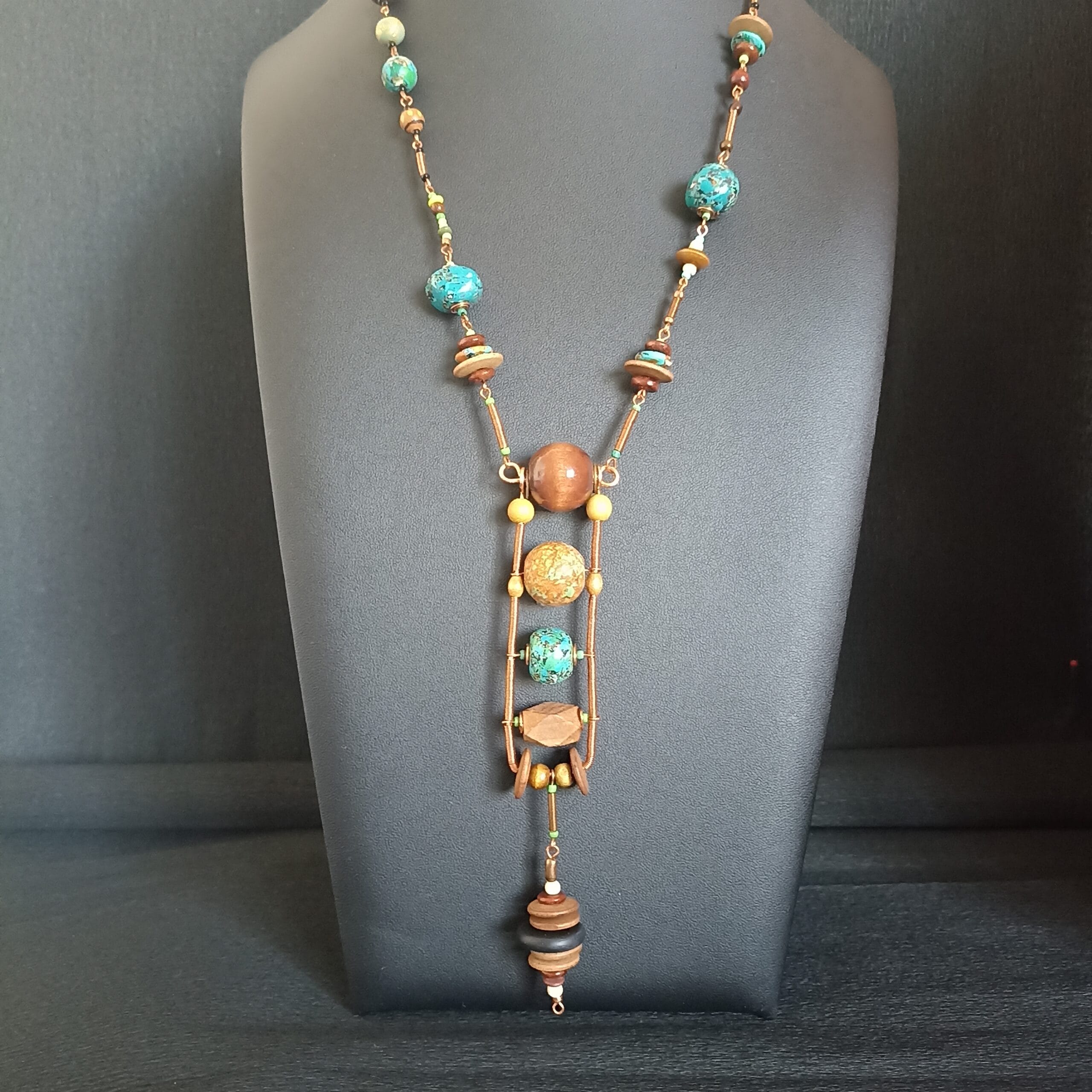 Collier de perles en pâte polymère bleu/vert faites main, perles de bois, éléments de fil de cuivre torsadé. Fermoir mousqueton. Longueur du collier: 58 cm. Longueur du pendentif: 15 cm. Il mettra parfaitement en valeur une tenue noire chic!